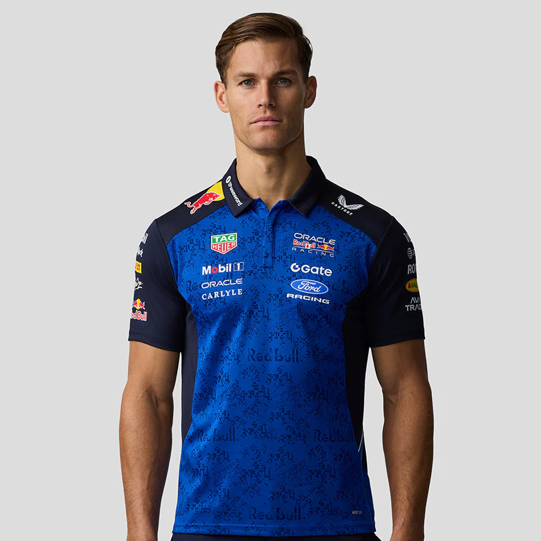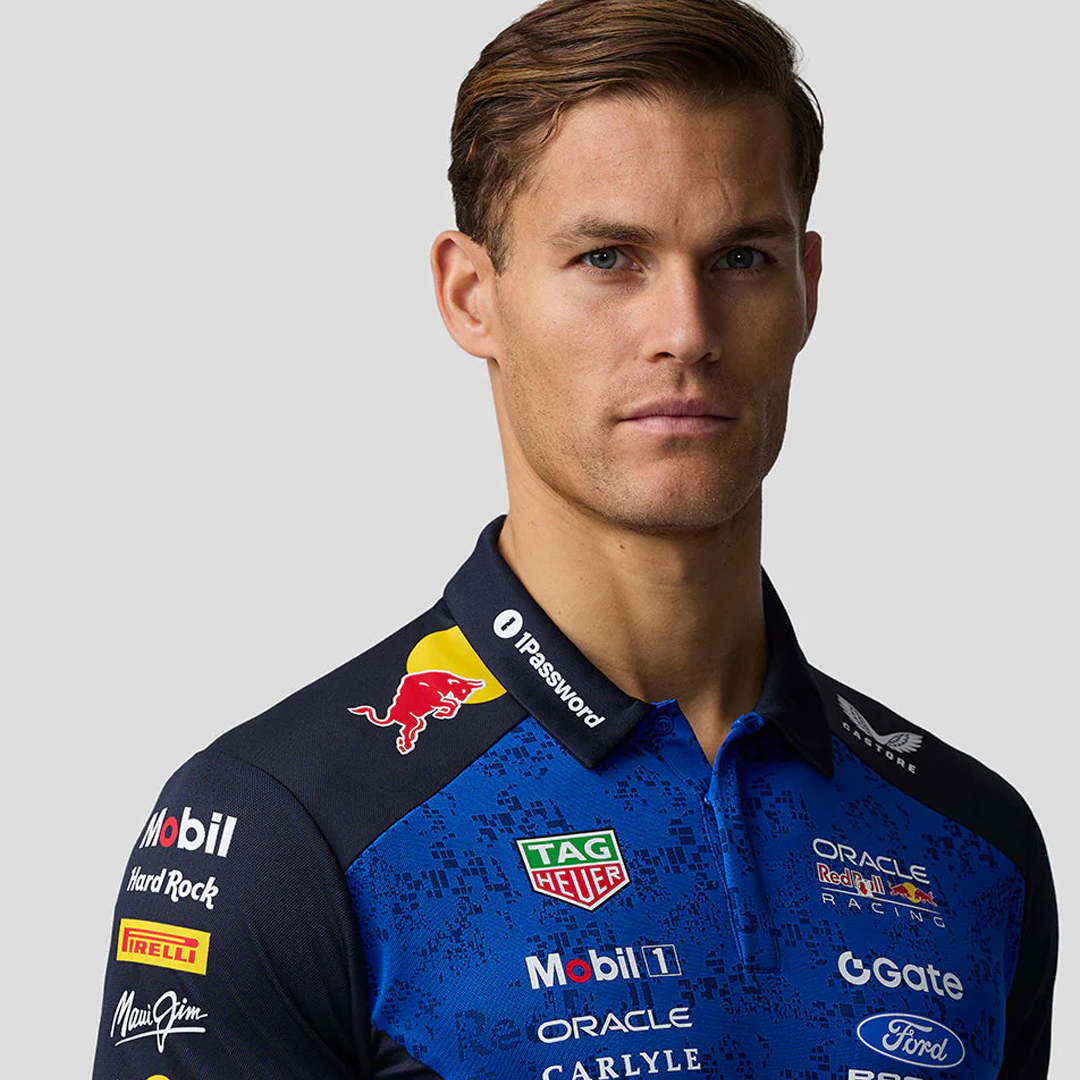 - Logotipos de Oracle Red Bull Racing, patrocinador y Castore en el pecho, las mangas, los hombros, el cuello y la parte superior de la espalda.