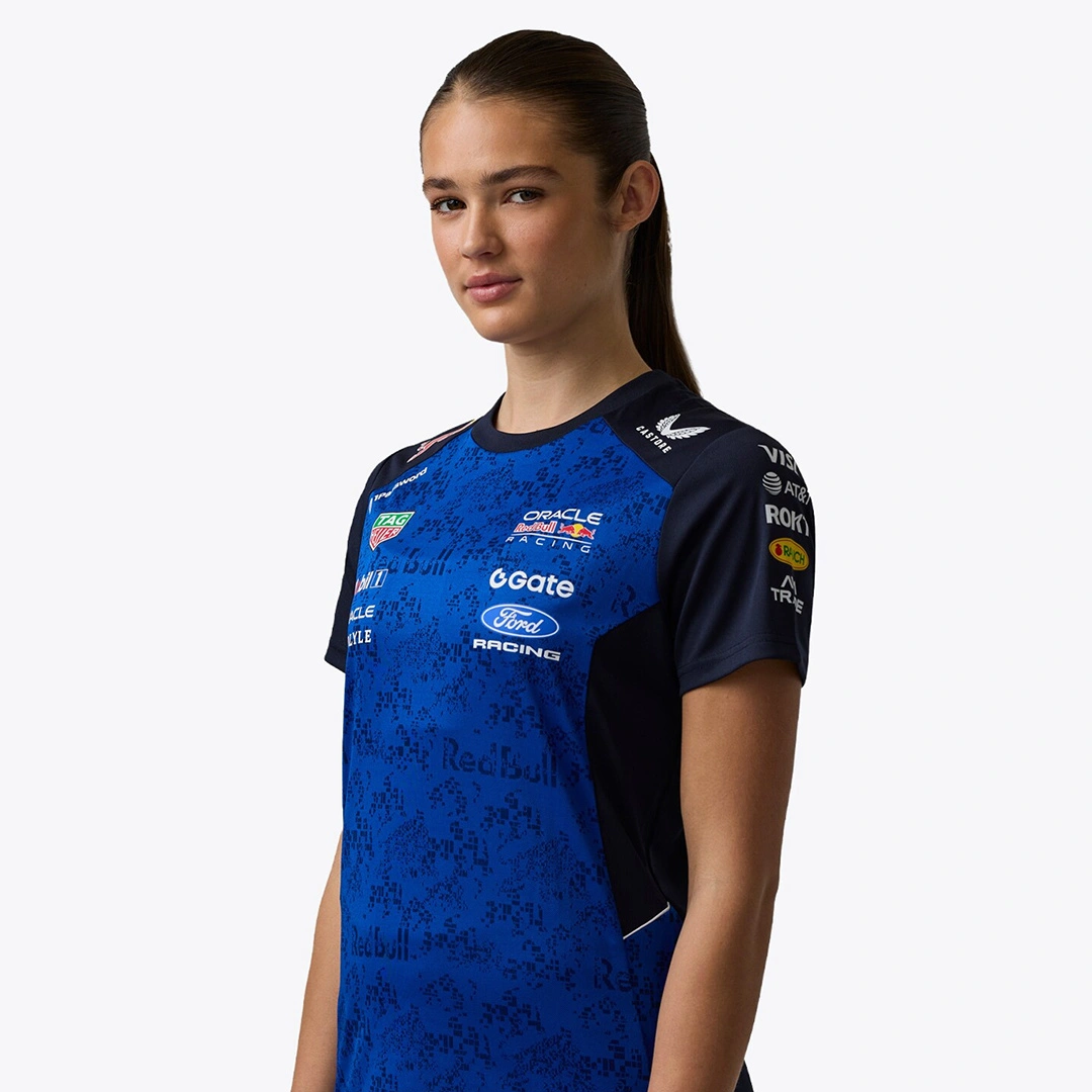 - Logotipos de Oracle Red Bull Racing, patrocinador y Castore en el pecho, las mangas, los hombros, el cuello y la parte superior de la espalda.