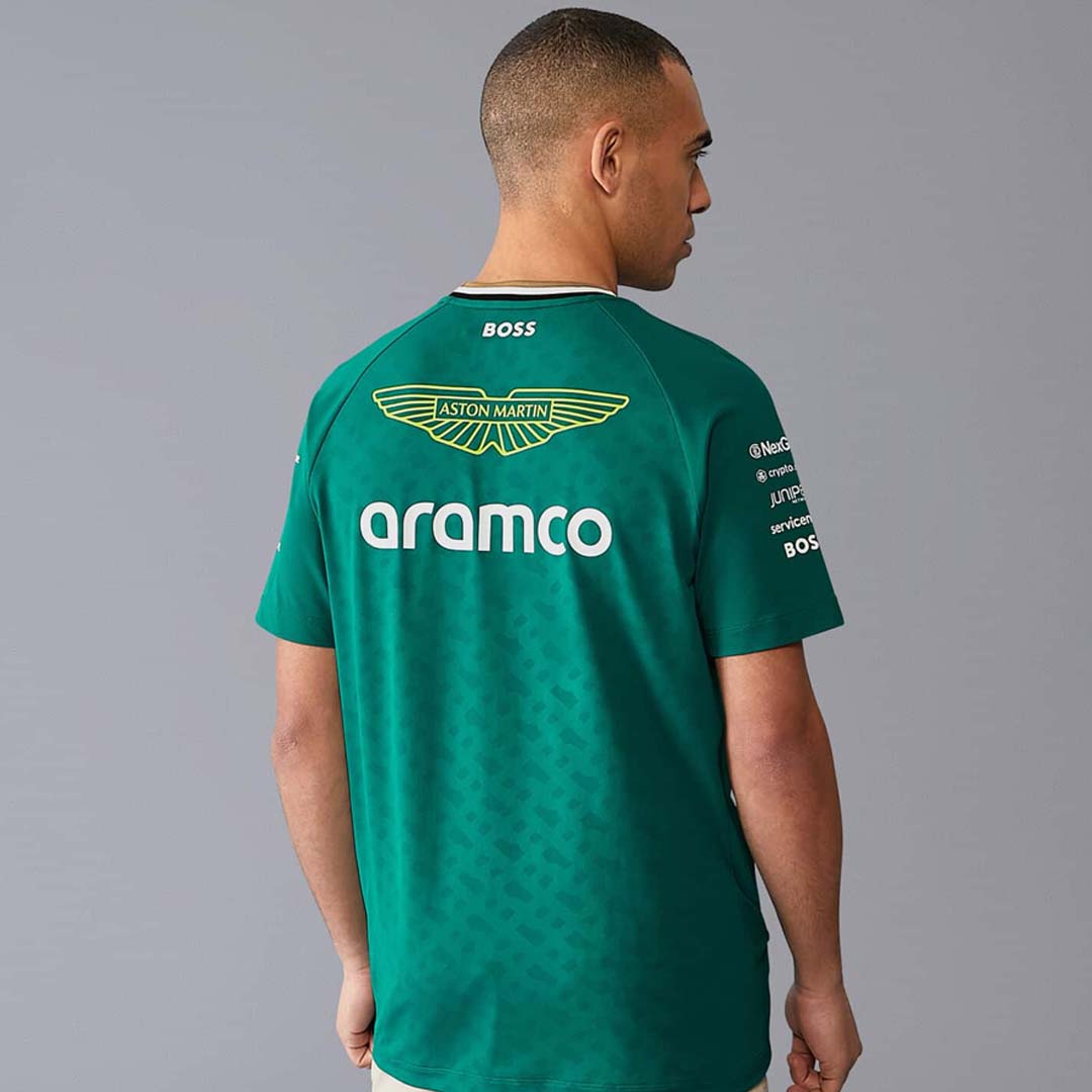 - Logotipo del equipo Aston Martin F1 en el pecho y la espalda.