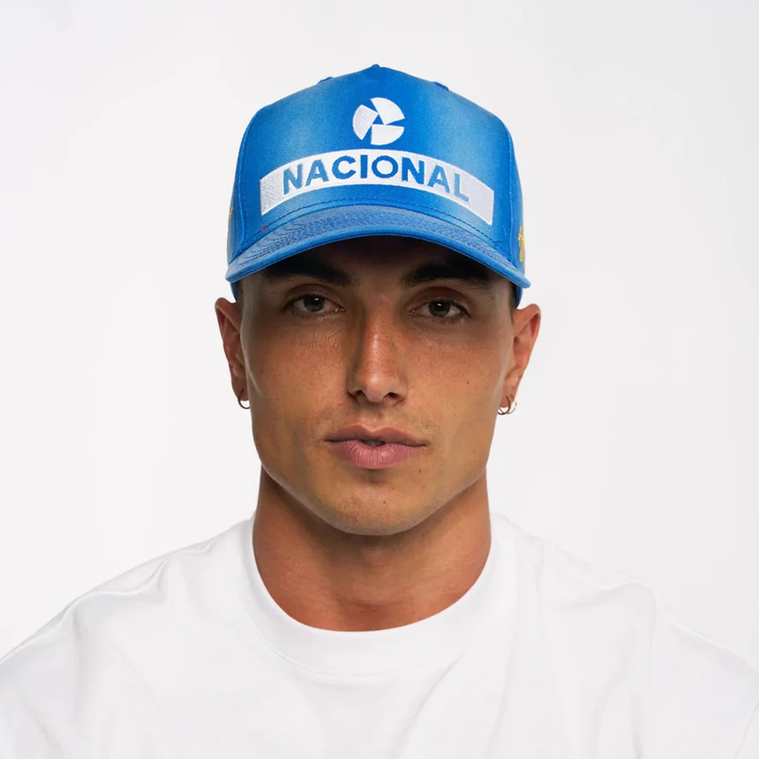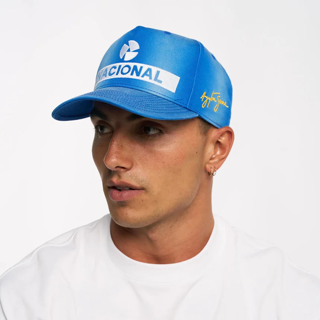 Con el logotipo Nacional impreso en la corona y la firma de Senna en ambos paneles laterales, esta gorra es imprescindible para cualquier fanático de las carreras.